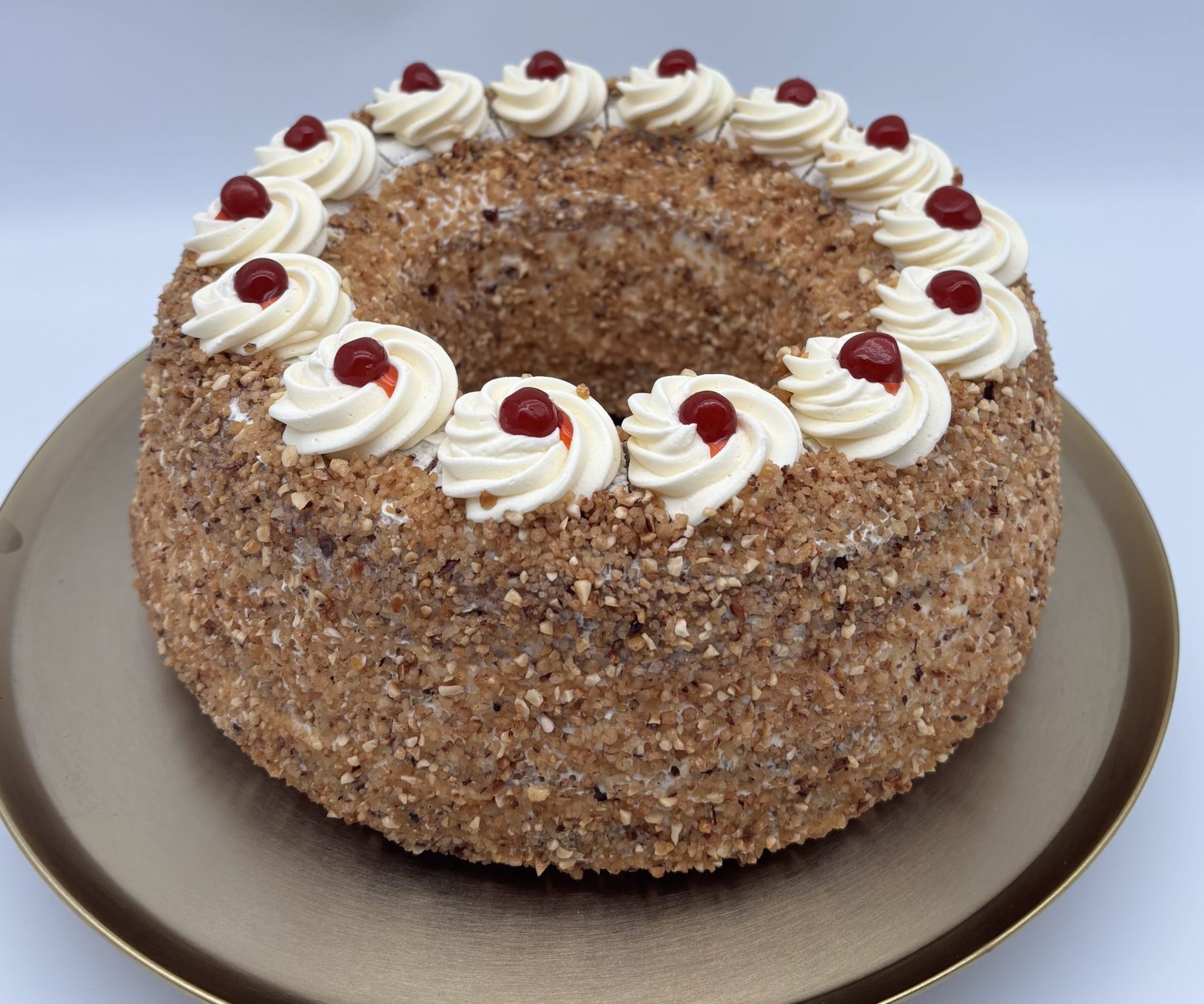 gefüllt mit leichter Vanillebuttercreme und roter Fruchtfüllung, umhüllt mit Mandelkrokant