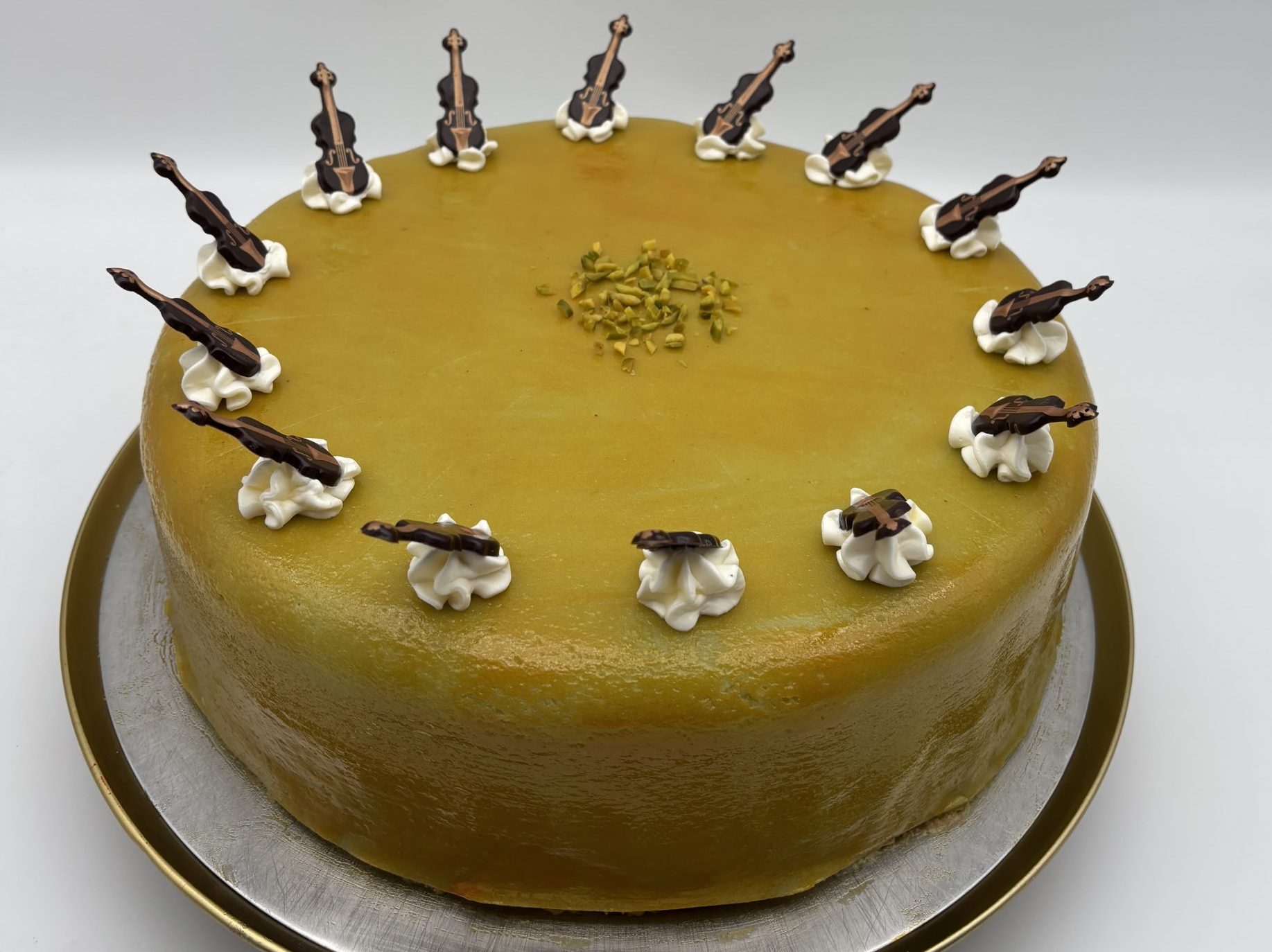 Pistazienbuttercreme und Nugatbuttercreme im Wechsel, überzogen mit einer hauchdünnen Schicht Marzipan